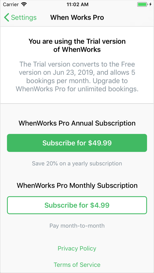 Your WhenWorks Pro subscription will be charged to your credit card through your iTunes account. Your subscription will automatically renew (every month or every year, depending on the term or your subscription) unless cancelled at least 24 hours before the end of the current period.
