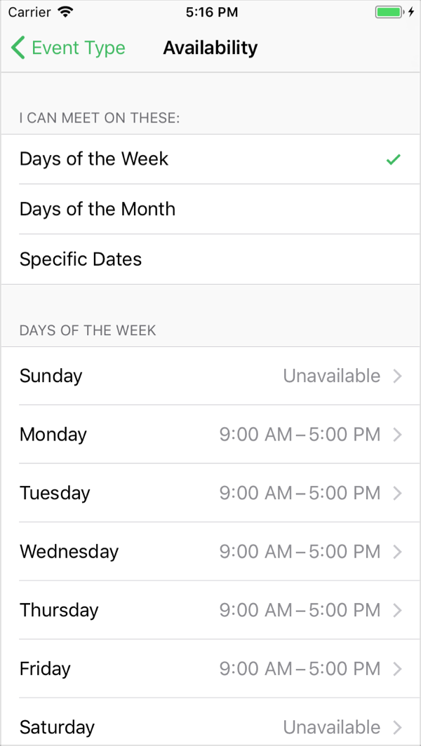 - Convenience – Since WhenWorks is an app, it’s super convenient to create event types and modify availability rules as needed and send email links to clients or colleagues while on the bus/train or out and about without having to login to a website on your desktop.